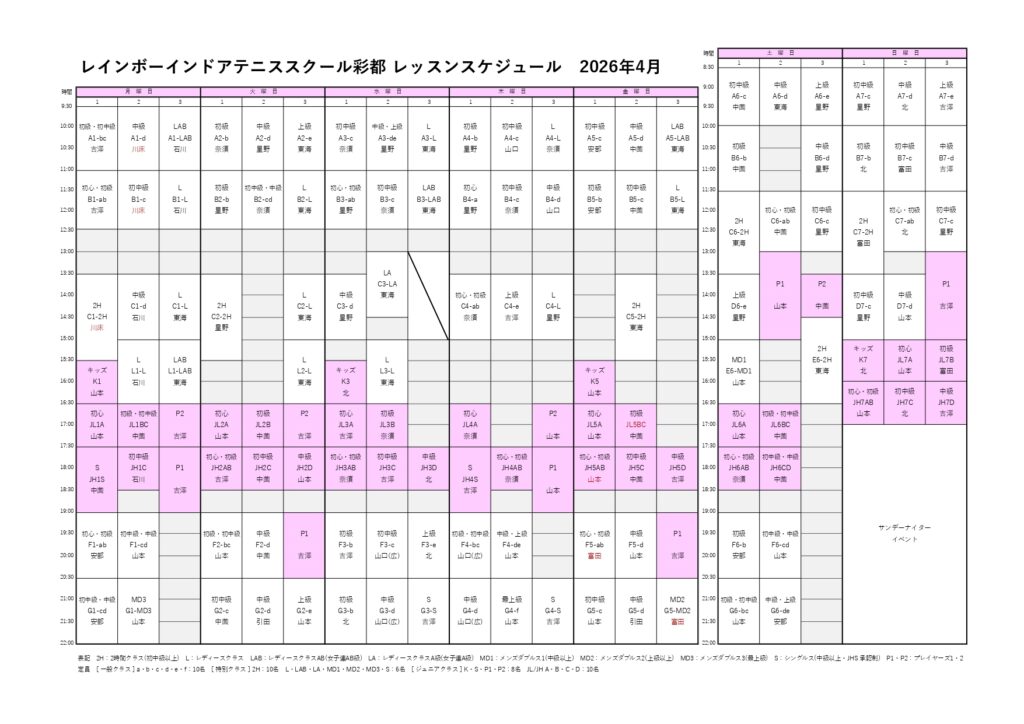 ・クラス時間割表はこちら(PDFファイル)からご確認ください。 ・2026年4月クラス表PDF